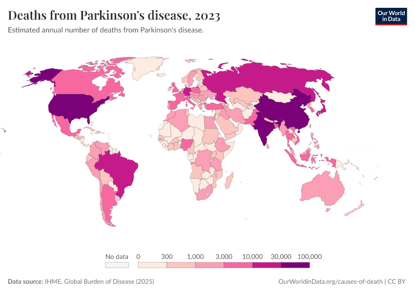 IHME, Global Burden of Disease (2025) – with major processing by Our World in Data. “Deaths from Parkinson's disease” [dataset]. IHME, Global Burden of Disease, “Global Burden of Disease - Deaths” [original data]. Retrieved February 25, 2026 from https://style-housekeeper-simplifyre.owid.pages.dev:8789/20260211-174736/grapher/deaths-from-parkinsons-disease.html (archived on February 11, 2026).