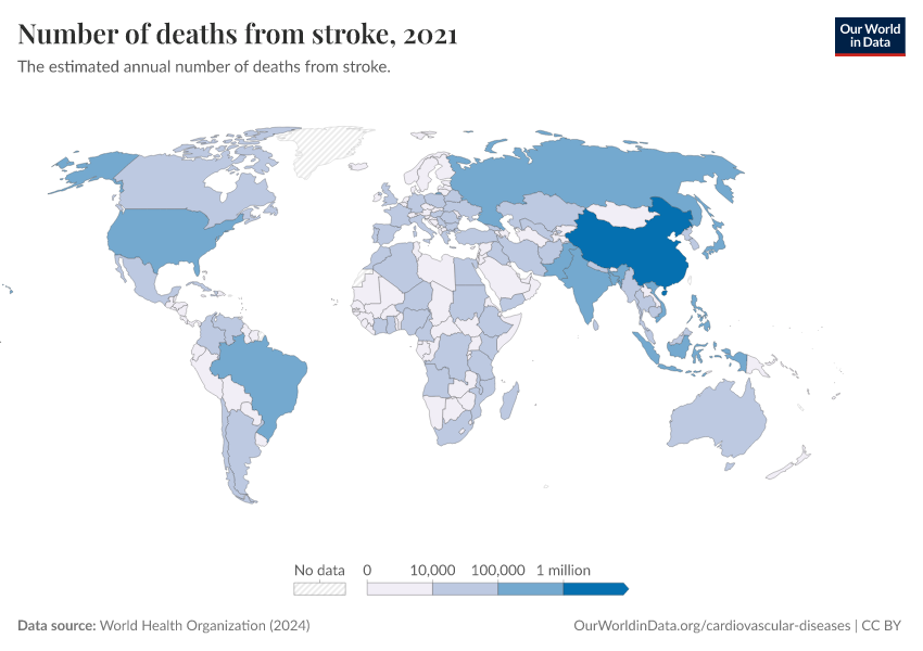 World Health Organization (2024) – with major processing by Our World in Data. “Number of deaths from stroke” [dataset]. World Health Organization, “Global Health Estimates” [original data]. Retrieved February 25, 2026 from https://style-housekeeper-simplifyre.owid.pages.dev:8789/20250909-093708/grapher/deaths-from-strokes-ghe.html (archived on September 9, 2025).