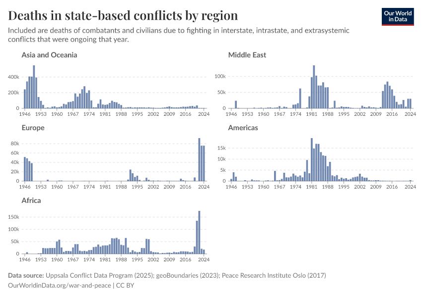 “Data Page: Deaths in state-based conflicts by region”, part of the following publication: Bastian Herre, Lucas Rodés-Guirao, and Max Roser (2024) - “War and Peace”. Data adapted from Uppsala Conflict Data Program, geoBoundaries, Peace Research Institute Oslo. Retrieved from https://style-housekeeper-simplifyre.owid.pages.dev:8789/20260119-070102/grapher/deaths-in-state-based-conflicts-by-region.html [online resource] (archived on January 19, 2026).How to cite this data