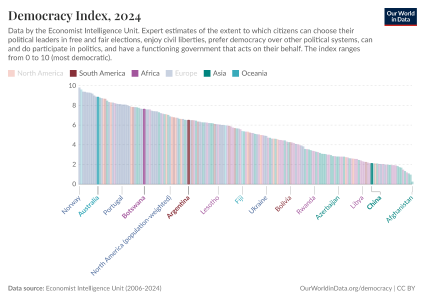 Economist Intelligence Unit (2006-2024) – processed by Our World in Data. “Democracy index – Economist Intelligence Unit” [dataset]. Economist Intelligence Unit, “Democracy Index 2021: The China challenge”; Economist Intelligence Unit, “Democracy Index 2022: Frontline democracy and the battle for Ukraine”; Economist Intelligence Unit, “Democracy Index 2023: Age of Conflict”; Economist Intelligence Unit, “Democracy Index 2024: What's wrong with representative democracy?”; Gapminder, “Democracy Index v4”; Various sources, “Population” [original data]. Retrieved February 25, 2026 from https://style-housekeeper-simplifyre.owid.pages.dev:8789/20260119-070102/grapher/democracy-index-eiu.html (archived on January 19, 2026).