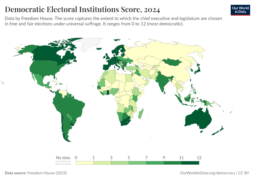 Freedom House (2025) – processed by Our World in Data. “Democratic Electoral Institutions Score” [dataset]. Freedom House, “Freedom in the World” [original data]. Retrieved February 25, 2026 from https://style-housekeeper-simplifyre.owid.pages.dev:8789/20260204-170225/grapher/democratic-electoral-institutions-fh.html (archived on February 4, 2026).