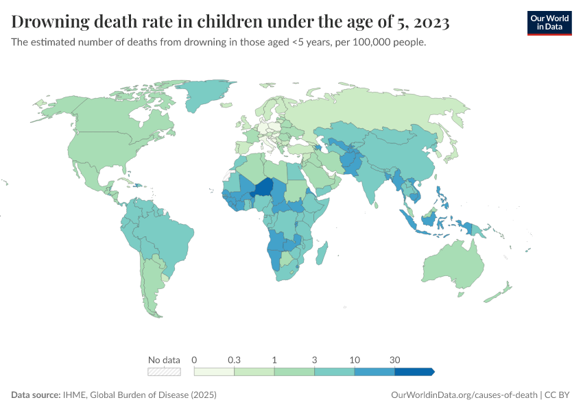 IHME, Global Burden of Disease (2025) – with major processing by Our World in Data. “Drowning death rate in children under the age of 5” [dataset]. IHME, Global Burden of Disease, “Global Burden of Disease - Deaths” [original data]. Retrieved February 25, 2026 from https://style-housekeeper-simplifyre.owid.pages.dev:8789/20260211-174736/grapher/drowning-death-rates-under-5.html (archived on February 11, 2026).