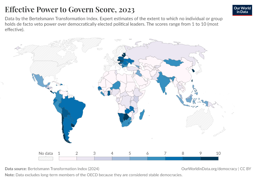 “Data Page: Effective Power to Govern Score”, part of the following publication: Bastian Herre, Lucas Rodés-Guirao, and Esteban Ortiz-Ospina (2013) - “Democracy”. Data adapted from Bertelsmann Transformation Index. Retrieved from https://style-housekeeper-simplifyre.owid.pages.dev:8789/20260204-170225/grapher/effective-power-to-govern-score-bti.html [online resource] (archived on February 4, 2026).How to cite this data
