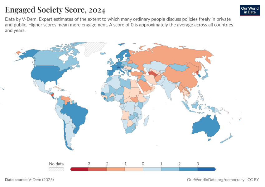 “Data Page: Engaged society”, part of the following publication: Bastian Herre, Lucas Rodés-Guirao, and Esteban Ortiz-Ospina (2013) - “Democracy”. Data adapted from V-Dem. Retrieved from https://style-housekeeper-simplifyre.owid.pages.dev:8789/20260204-170225/grapher/engaged-society-score.html [online resource] (archived on February 4, 2026).How to cite this data