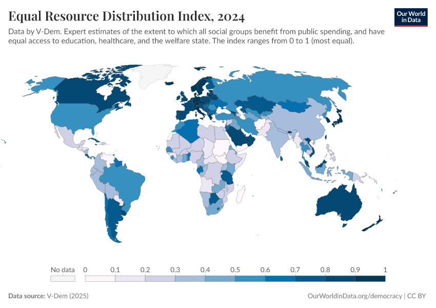 “Data Page: Equal resource distribution index”, part of the following publication: Bastian Herre, Lucas Rodés-Guirao, and Esteban Ortiz-Ospina (2013) - “Democracy”. Data adapted from V-Dem. Retrieved from https://style-housekeeper-simplifyre.owid.pages.dev:8789/20260119-070102/grapher/equal-resource-distribution-index.html [online resource] (archived on January 19, 2026).How to cite this data