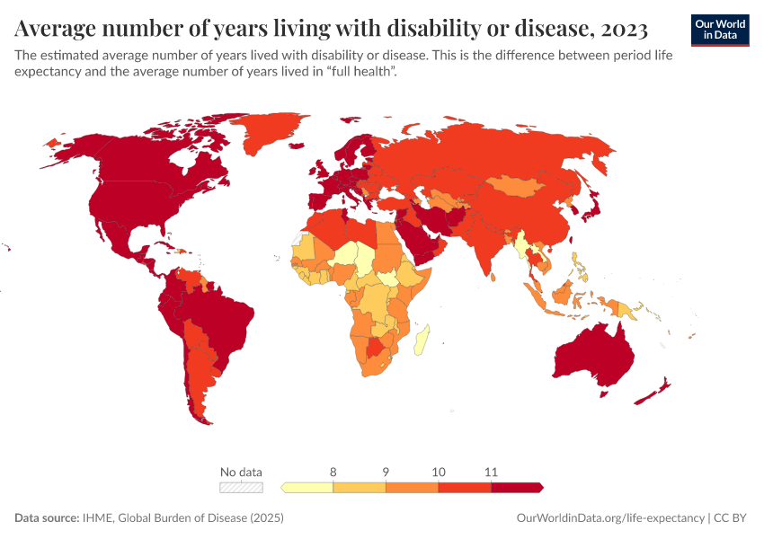 “Data Page: Average number of years living with disability or disease”, part of the following publication: Saloni Dattani, Lucas Rodés-Guirao, Hannah Ritchie, Esteban Ortiz-Ospina, and Max Roser (2023) - “Life Expectancy”. Data adapted from IHME, Global Burden of Disease. Retrieved from https://style-housekeeper-simplifyre.owid.pages.dev:8789/20260213-171235/grapher/expected-years-of-living-with-disability-or-disease-burden.html [online resource] (archived on February 13, 2026).How to cite this data