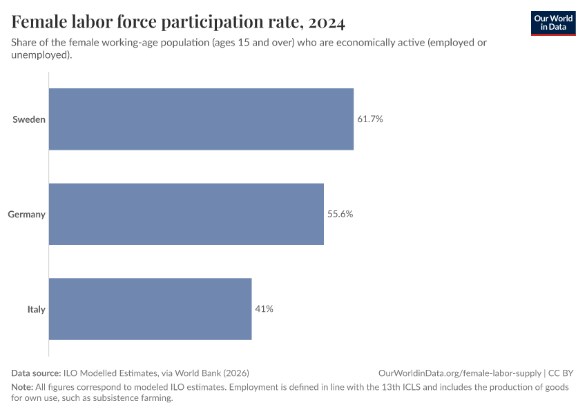 “Data Page: Female labor force participation rate”. Our World in Data (2026). Data adapted from ILO Modelled Estimates, via World Bank. Retrieved from https://style-housekeeper-simplifyre.owid.pages.dev:8789/20260223-234835/grapher/female-labor-force-participation-rates.html [online resource] (archived on February 23, 2026).How to cite this data