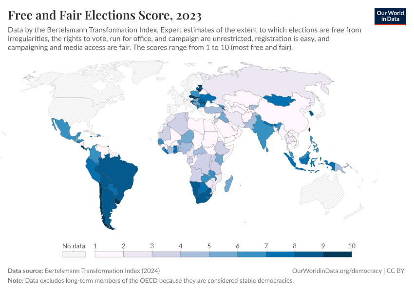 Bertelsmann Transformation Index (2024) – processed by Our World in Data. “Free and Fair Elections Score” [dataset]. Bertelsmann Transformation Index, “Bertelsmann Transformation Index, Scores” [original data]. Retrieved February 25, 2026 from https://style-housekeeper-simplifyre.owid.pages.dev:8789/20260204-170225/grapher/free-fair-elections-bti.html (archived on February 4, 2026).