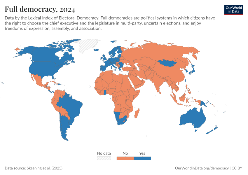 Skaaning et al. (2025) – processed by Our World in Data. “Full democracy” [dataset]. Skaaning et al., “Lexical Index of Electoral Democracy (LIED) v6.8” [original data]. Retrieved February 25, 2026 from https://style-housekeeper-simplifyre.owid.pages.dev:8789/20260119-065148/grapher/full-democracy-lexical.html (archived on January 19, 2026).