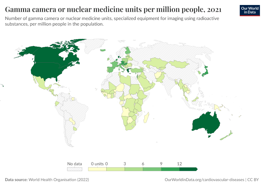 “Data Page: Gamma camera or nuclear medicine units per million people”, part of the following publication: Saloni Dattani, Veronika Samborska, Hannah Ritchie, and Max Roser (2023) - “Cardiovascular Diseases”. Data adapted from World Health Organisation. Retrieved from https://style-housekeeper-simplifyre.owid.pages.dev:8789/20250909-093708/grapher/gamma-camera-or-nuclear-medicine-availability.html [online resource] (archived on September 9, 2025).How to cite this data