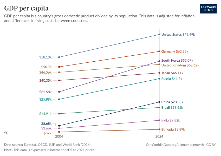 “Data Page: GDP per capita”, part of the following publication: Max Roser, Bertha Rohenkohl, Pablo Arriagada, Joe Hasell, Hannah Ritchie, and Esteban Ortiz-Ospina (2023) - “Economic Growth”. Data adapted from Eurostat, OECD, IMF, and World Bank. Retrieved from https://style-housekeeper-simplifyre.owid.pages.dev:8789/20260202-180243/grapher/gdp-per-capita-worldbank.html [online resource] (archived on February 2, 2026).How to cite this data