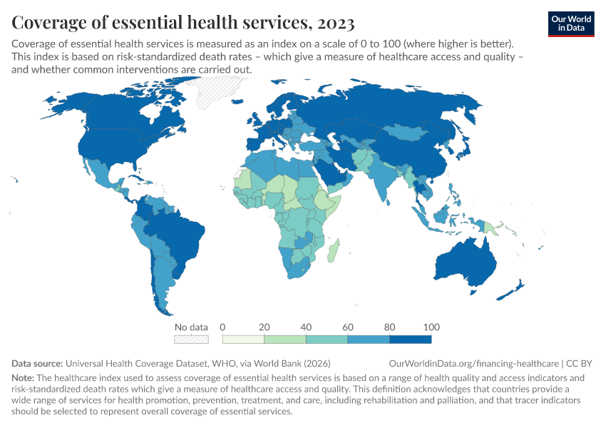 “Data Page: Coverage of essential health services”. Our World in Data (2026). Data adapted from Universal Health Coverage Dataset, WHO, via World Bank. Retrieved from https://style-housekeeper-simplifyre.owid.pages.dev:8789/20260202-181317/grapher/healthcare-access-quality-un.html [online resource] (archived on February 2, 2026).How to cite this data