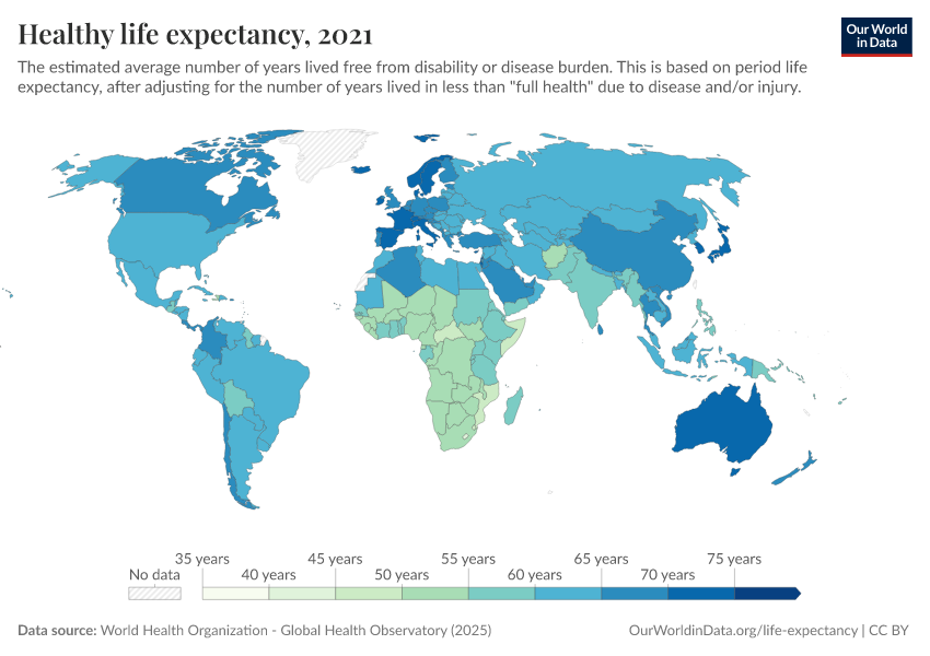 “Data Page: Healthy life expectancy”. Our World in Data (2026). Data adapted from World Health Organization. Retrieved from https://style-housekeeper-simplifyre.owid.pages.dev:8789/20260119-070102/grapher/healthy-life-expectancy-at-birth.html [online resource] (archived on January 19, 2026).How to cite this data