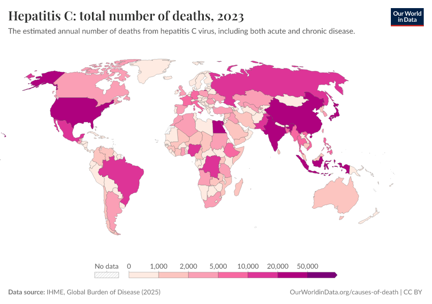 “Data Page: Hepatitis C: total number of deaths”, part of the following publication: Esteban Ortiz-Ospina and Max Roser (2016) - “Global Health”. Data adapted from IHME, Global Burden of Disease. Retrieved from https://style-housekeeper-simplifyre.owid.pages.dev:8789/20260211-174736/grapher/hepatitis-c-number-of-deaths.html [online resource] (archived on February 11, 2026).How to cite this data