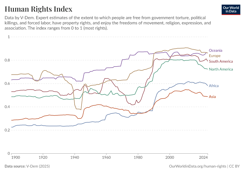 V-Dem (2025) – processed by Our World in Data. “Human rights index – V-Dem” [dataset]. V-Dem, “Democracy report v15” [original data]. Retrieved February 25, 2026 from https://style-housekeeper-simplifyre.owid.pages.dev:8789/20260119-070102/grapher/human-rights-index-vdem.html (archived on January 19, 2026).