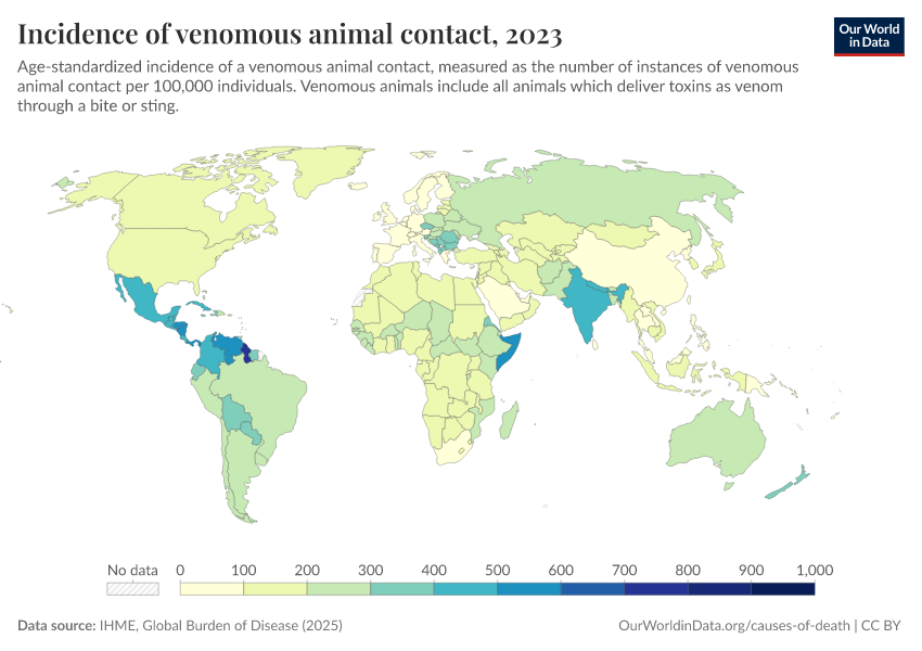 “Data Page: Incidence of venomous animal contact”, part of the following publication: Esteban Ortiz-Ospina and Max Roser (2016) - “Global Health”. Data adapted from IHME, Global Burden of Disease. Retrieved from https://style-housekeeper-simplifyre.owid.pages.dev:8789/20260212-172132/grapher/incidence-of-venomous-animal-contact.html [online resource] (archived on February 12, 2026).How to cite this data