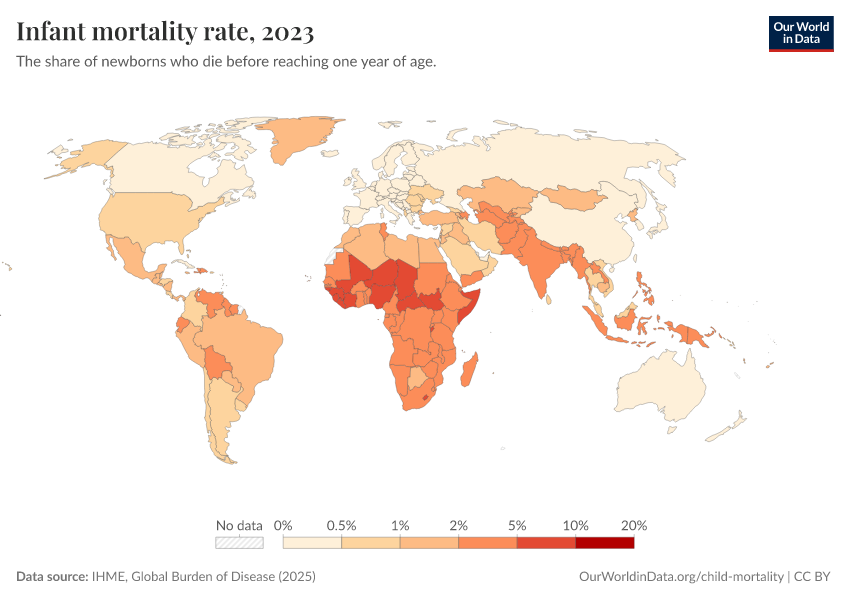 “Data Page: Infant mortality rate”, part of the following publication: Esteban Ortiz-Ospina and Max Roser (2016) - “Global Health”. Data adapted from IHME, Global Burden of Disease. Retrieved from https://style-housekeeper-simplifyre.owid.pages.dev:8789/20260213-140117/grapher/infant-mortality-rate.html [online resource] (archived on February 13, 2026).How to cite this data