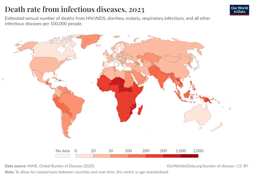 IHME, Global Burden of Disease (2025) – with major processing by Our World in Data. “Death rate from infectious diseases” [dataset]. IHME, Global Burden of Disease, “Global Burden of Disease - Deaths” [original data]. Retrieved February 25, 2026 from https://style-housekeeper-simplifyre.owid.pages.dev:8789/20260211-174736/grapher/infectious-disease-death-rates.html (archived on February 11, 2026).