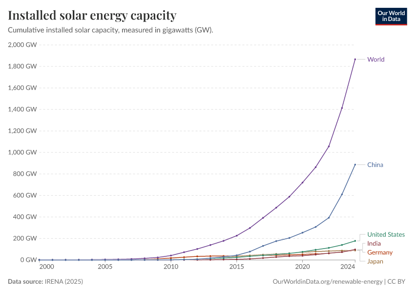 “Data Page: Total solar capacity”, part of the following publication: Hannah Ritchie, Pablo Rosado, and Max Roser (2023) - “Energy”. Data adapted from IRENA. Retrieved from https://style-housekeeper-simplifyre.owid.pages.dev:8789/20260119-065148/grapher/installed-solar-pv-capacity.html [online resource] (archived on January 19, 2026).How to cite this data