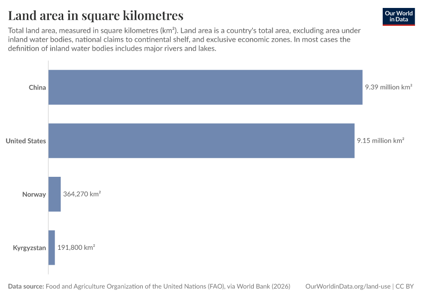 “Data Page: Land area in square kilometres”. Our World in Data (2026). Data adapted from Food and Agriculture Organization of the United Nations (FAO), via World Bank. Retrieved from https://style-housekeeper-simplifyre.owid.pages.dev:8789/20260202-181317/grapher/land-area-km.html [online resource] (archived on February 2, 2026).How to cite this data