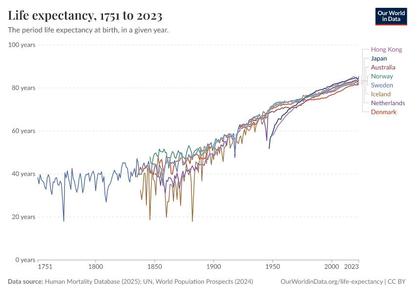 “Data Page: Life expectancy at birth”, part of the following publication: Saloni Dattani, Lucas Rodés-Guirao, Hannah Ritchie, Esteban Ortiz-Ospina, and Max Roser (2023) - “Life Expectancy”. Data adapted from Human Mortality Database, United Nations. Retrieved from https://style-housekeeper-simplifyre.owid.pages.dev:8789/20251022-222946/grapher/life-expectancy-hmd-unwpp.html [online resource] (archived on October 22, 2025).How to cite this data