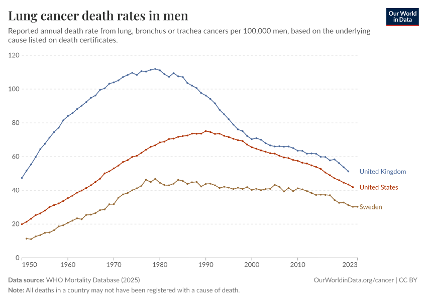 “Data Page: Lung cancer death rates in men”, part of the following publication: Saloni Dattani, Fiona Spooner, Hannah Ritchie, and Max Roser (2023) - “Causes of Death”. Data adapted from WHO Mortality Database. Retrieved from https://style-housekeeper-simplifyre.owid.pages.dev:8789/20250909-093708/grapher/lung-cancer-death-rates-males.html [online resource] (archived on September 9, 2025).How to cite this data
