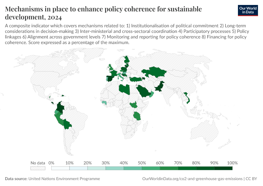 United Nations Environment Programme – processed by Our World in Data. “Mechanisms in place to enhance policy coherence for sustainable development” [dataset]. United Nations Environment Programme, “Data from multiple sources” [original data]. Retrieved February 25, 2026 from https://style-housekeeper-simplifyre.owid.pages.dev:8789/20251120-211749/grapher/mechanisms-to-enhance-policy-for-sustainable-development.html (archived on November 20, 2025).