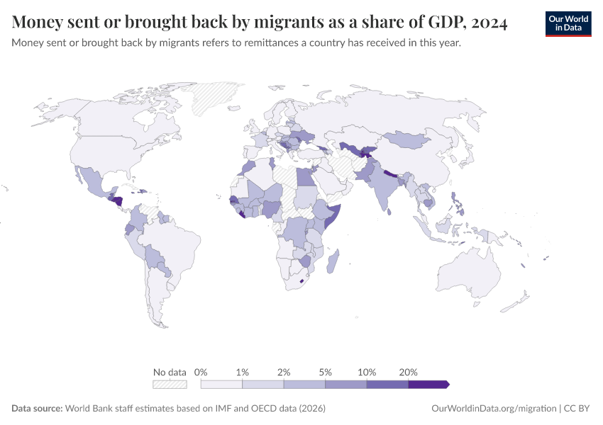 “Data Page: Money sent or brought back by migrants as a share of GDP”. Our World in Data (2026). Data adapted from World Bank staff estimates based on IMF and OECD data. Retrieved from https://style-housekeeper-simplifyre.owid.pages.dev:8789/20260202-181317/grapher/money-sent-or-brought-back-by-migrants-as-a-share-of-gdp.html [online resource] (archived on February 2, 2026).How to cite this data