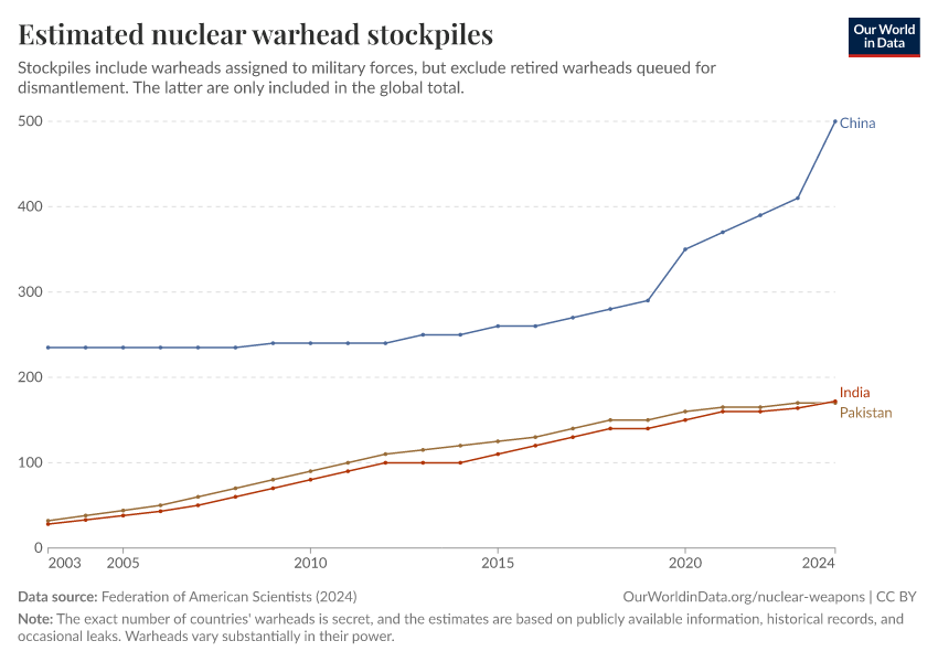 “Data Page: Estimated nuclear warhead stockpiles”, part of the following publication: Bastian Herre, Pablo Rosado, and Max Roser (2024) - “Nuclear Weapons”. Data adapted from Federation of American Scientists. Retrieved from https://style-housekeeper-simplifyre.owid.pages.dev:8789/20250909-093708/grapher/nuclear-warhead-stockpiles-lines.html [online resource] (archived on September 9, 2025).How to cite this data