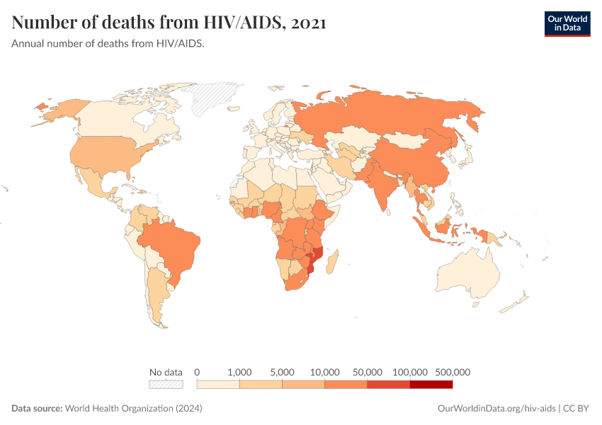 World Health Organization (2024) – with major processing by Our World in Data. “Number of deaths from HIV/AIDS” [dataset]. World Health Organization, “Global Health Estimates” [original data]. Retrieved February 25, 2026 from https://style-housekeeper-simplifyre.owid.pages.dev:8789/20250909-093708/grapher/number-of-deaths-from-hivaids-who.html (archived on September 9, 2025).