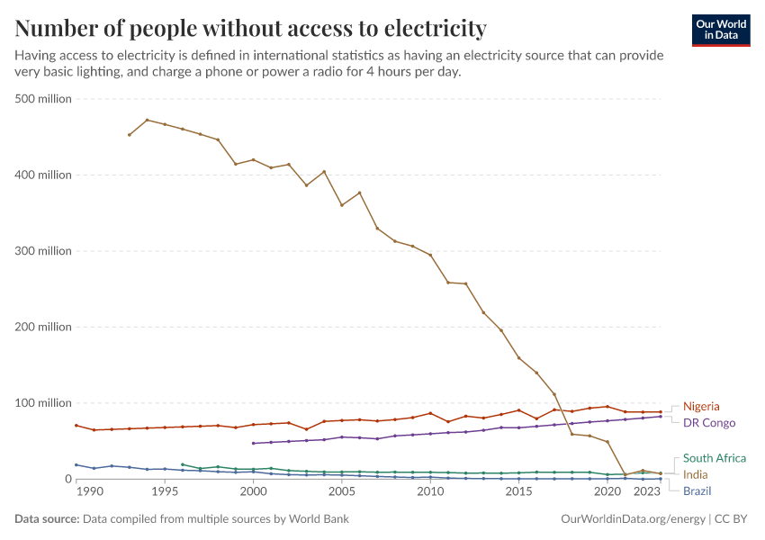 “Data Page: Number of people without access to electricity”, part of the following publication: Hannah Ritchie, Pablo Rosado, and Max Roser (2019) - “Access to Energy”. Data adapted from SDG 7.1.1 Electrification Dataset, World Bank, via World Bank, United Nations Population Division, national statistical offices, and Eurostat, via World Bank. Retrieved from https://style-housekeeper-simplifyre.owid.pages.dev:8789/20260202-181317/grapher/people-without-electricity-country.html [online resource] (archived on February 2, 2026).