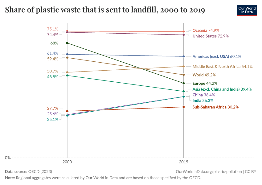 “Data Page: Share of plastic waste that is sent to landfill”, part of the following publication: Hannah Ritchie, Veronika Samborska, and Max Roser (2023) - “Plastic Pollution”. Data adapted from OECD. Retrieved from https://style-housekeeper-simplifyre.owid.pages.dev:8789/20250909-093708/grapher/plastic-waste-landfill.html [online resource] (archived on September 9, 2025).How to cite this data