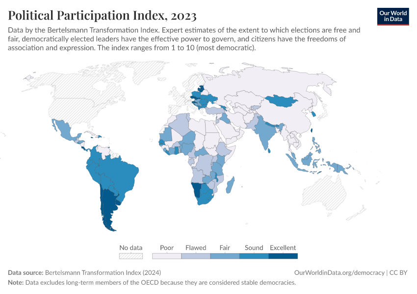 “Data Page: Political Participation Index”, part of the following publication: Bastian Herre, Lucas Rodés-Guirao, and Esteban Ortiz-Ospina (2013) - “Democracy”. Data adapted from Bertelsmann Transformation Index. Retrieved from https://style-housekeeper-simplifyre.owid.pages.dev:8789/20260105-133053/grapher/political-participation-index-bti.html [online resource] (archived on January 5, 2026).How to cite this data