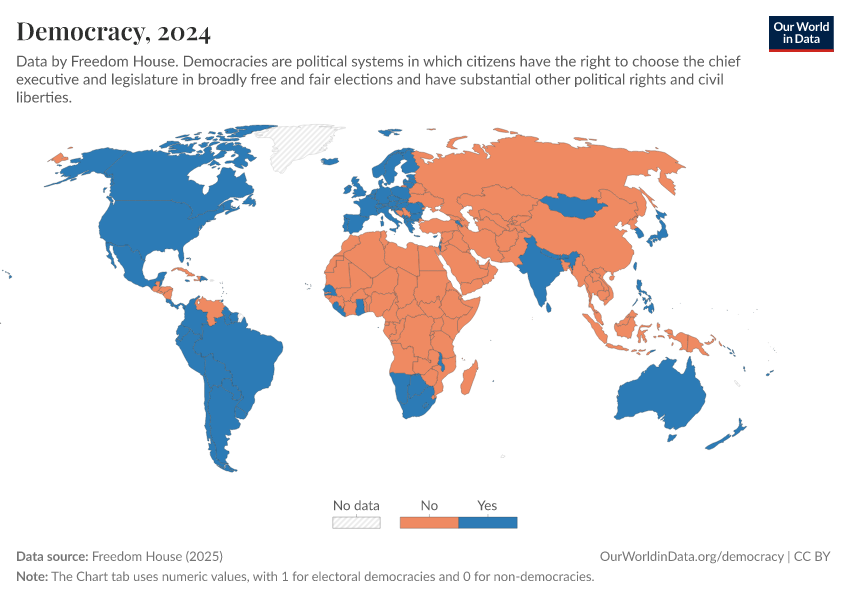“Data Page: Democracy”, part of the following publication: Bastian Herre, Lucas Rodés-Guirao, and Esteban Ortiz-Ospina (2013) - “Democracy”. Data adapted from Freedom House. Retrieved from https://style-housekeeper-simplifyre.owid.pages.dev:8789/20260119-070102/grapher/political-regime-dem-fh.html [online resource] (archived on January 19, 2026).How to cite this data