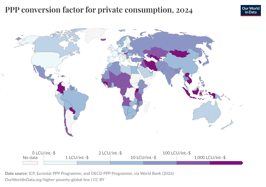 “Data Page: PPP conversion factor for private consumption”. Our World in Data (2026). Data adapted from ICP, Eurostat PPP Programme, and OECD PPP Programme, via World Bank. Retrieved from https://style-housekeeper-simplifyre.owid.pages.dev:8789/20260202-181317/grapher/ppp-conversion-factor-for-private-consumption.html [online resource] (archived on February 2, 2026).How to cite this data