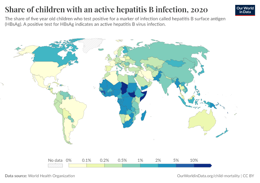 World Health Organization – processed by Our World in Data. “Share of children with an active hepatitis B infection” [dataset]. World Health Organization, “Based on serosurveys at city, subnational or national level. World Health Organisation (WHO).” [original data]. Retrieved February 25, 2026 from https://style-housekeeper-simplifyre.owid.pages.dev:8789/20260130-180113/grapher/prevalence-of-hepatitis-b-surface-antigen.html (archived on January 30, 2026).