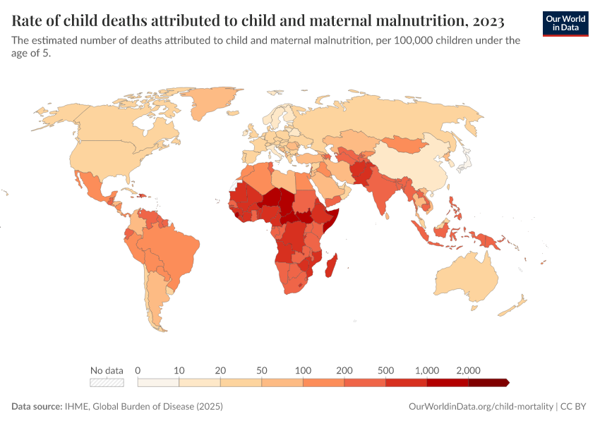 “Data Page: Rate of child deaths attributed to child and maternal malnutrition”, part of the following publication: Esteban Ortiz-Ospina and Max Roser (2016) - “Global Health”. Data adapted from IHME, Global Burden of Disease. Retrieved from https://style-housekeeper-simplifyre.owid.pages.dev:8789/20260213-112438/grapher/rate-of-child-deaths-attributed-to-child-and-maternal-malnutrition.html [online resource] (archived on February 13, 2026).How to cite this data