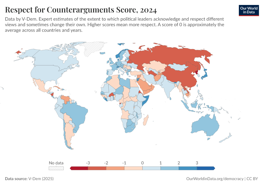 “Data Page: Respect for counterarguments”, part of the following publication: Bastian Herre, Lucas Rodés-Guirao, and Esteban Ortiz-Ospina (2013) - “Democracy”. Data adapted from V-Dem. Retrieved from https://style-housekeeper-simplifyre.owid.pages.dev:8789/20260204-170225/grapher/respect-for-counterarguments-score.html [online resource] (archived on February 4, 2026).How to cite this data