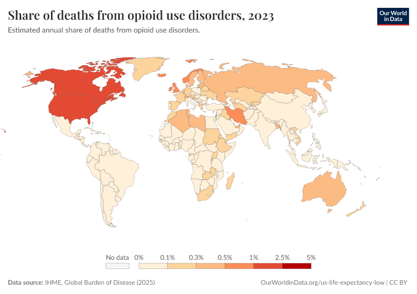 IHME, Global Burden of Disease (2025) – with major processing by Our World in Data. “Share of deaths from opioid use disorders” [dataset]. IHME, Global Burden of Disease, “Global Burden of Disease - Deaths” [original data]. Retrieved February 25, 2026 from https://style-housekeeper-simplifyre.owid.pages.dev:8789/20260211-174736/grapher/share-of-deaths-from-opioid-overdoses.html (archived on February 11, 2026).