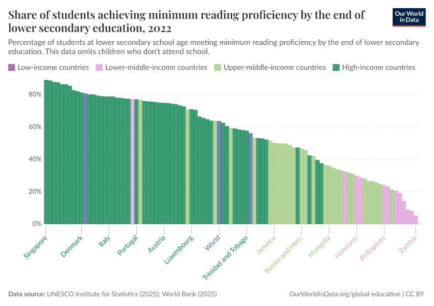 “Data Page: Share of students achieving minimum reading proficiency by the end of lower secondary education”, part of the following publication: Hannah Ritchie, Veronika Samborska, Esteban Ortiz-Ospina, and Max Roser (2023) - “Global Education”. Data adapted from UNESCO Institute for Statistics. Retrieved from https://style-housekeeper-simplifyre.owid.pages.dev:8789/20260122-091445/grapher/share-of-students-at-end-of-lower-secondary-education-with-minimum-reading-proficiency.html [online resource] (archived on January 22, 2026).How to cite this data