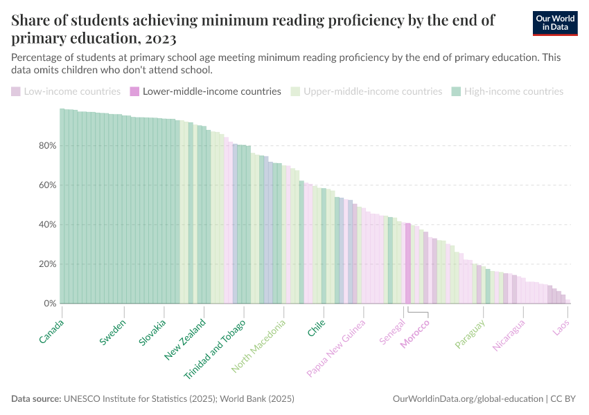 UNESCO Institute for Statistics (2025) – with minor processing by Our World in Data. “Share of students achieving minimum reading proficiency by the end of primary education” [dataset]. UNESCO Institute for Statistics, “UNESCO Institute for Statistics (UIS) - Education” [original data]. Retrieved February 25, 2026 from https://style-housekeeper-simplifyre.owid.pages.dev:8789/20260122-091445/grapher/share-of-students-at-end-of-primary-education-achieving-minimum-reading-proficiency.html (archived on January 22, 2026).