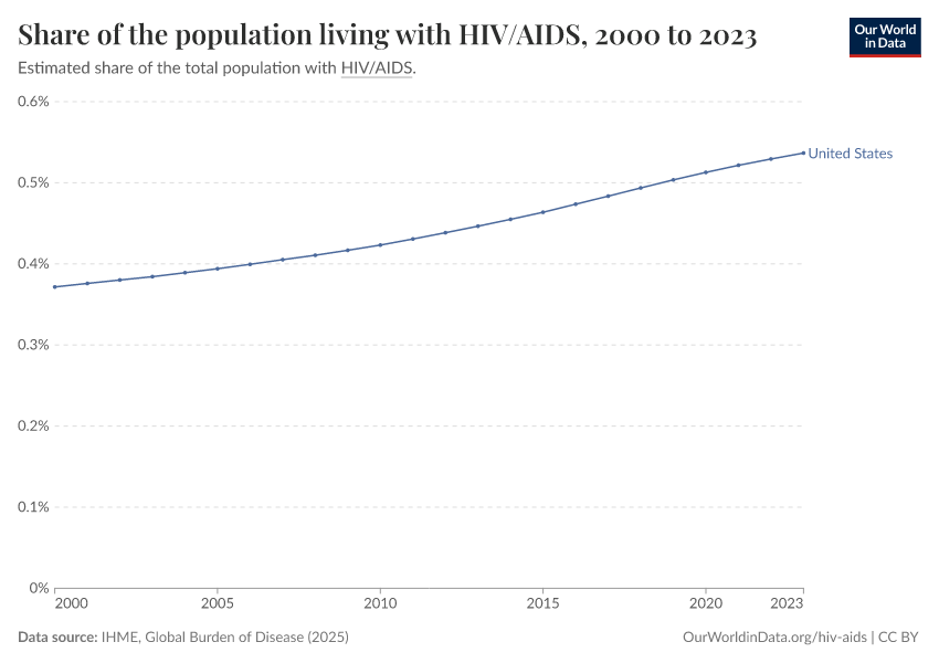 “Data Page: Share of the population living with HIV/AIDS”, part of the following publication: Esteban Ortiz-Ospina and Max Roser (2016) - “Global Health”. Data adapted from IHME, Global Burden of Disease. Retrieved from https://style-housekeeper-simplifyre.owid.pages.dev:8789/20260212-172859/grapher/share-of-the-population-living-with-hivaids.html [online resource] (archived on February 12, 2026).