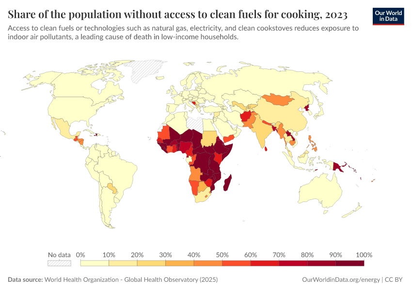 World Health Organization - Global Health Observatory (2025) – processed by Our World in Data. “Share of the population without access to clean fuels for cooking” [dataset]. World Health Organization, “Global Health Observatory” [original data]. Retrieved February 25, 2026 from https://style-housekeeper-simplifyre.owid.pages.dev:8789/20260119-070102/grapher/share-of-the-population-without-access-to-clean-fuels-for-cooking.html (archived on January 19, 2026).