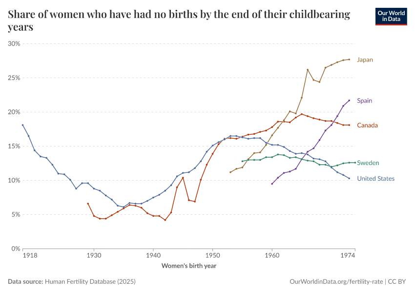 “Data Page: Share of women who have had no births by the end of their childbearing years”, part of the following publication: Saloni Dattani, Lucas Rodés-Guirao, and Max Roser (2025) - “Fertility Rate”. Data adapted from Human Fertility Database. Retrieved from https://style-housekeeper-simplifyre.owid.pages.dev:8789/20251022-230420/grapher/share-of-women-who-have-had-no-births-across-their-childbearing-years.html [online resource] (archived on October 22, 2025).How to cite this data