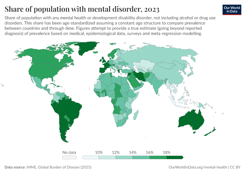 “Data Page: Share of population with mental disorder”, part of the following publication: Saloni Dattani, Lucas Rodés-Guirao, Hannah Ritchie, and Max Roser (2023) - “Mental Health”. Data adapted from IHME, Global Burden of Disease. Retrieved from https://style-housekeeper-simplifyre.owid.pages.dev:8789/20260212-100858/grapher/share-with-mental-health-or-development-disorder.html [online resource] (archived on February 12, 2026).How to cite this data