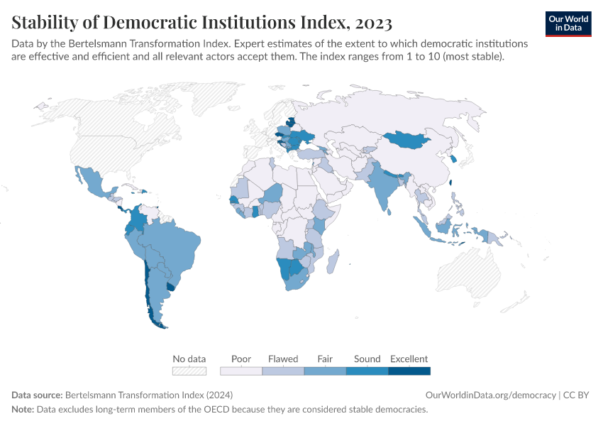 “Data Page: Stability of Democratic Institutions Index”, part of the following publication: Bastian Herre, Lucas Rodés-Guirao, and Esteban Ortiz-Ospina (2013) - “Democracy”. Data adapted from Bertelsmann Transformation Index. Retrieved from https://style-housekeeper-simplifyre.owid.pages.dev:8789/20260105-133053/grapher/stability-democratic-institutions-index-bti.html [online resource] (archived on January 5, 2026).How to cite this data