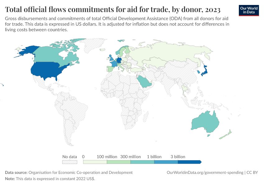 “Data Page: Total official flows commitments for aid for trade, by donor”. Our World in Data (2026). Data adapted from Organisation for Economic Co-operation and Development. Retrieved from https://style-housekeeper-simplifyre.owid.pages.dev:8789/20251120-211038/grapher/total-oda-for-aid-for-trade-by-donor.html [online resource] (archived on November 20, 2025).How to cite this data