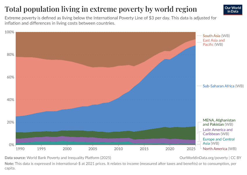 World Bank Poverty and Inequality Platform (2025) – with major processing by Our World in Data. “Total population living in extreme poverty by world region – World Bank” [dataset]. World Bank Poverty and Inequality Platform, “World Bank Poverty and Inequality Platform (PIP) 20250930_2021, 20250930_2017” [original data]. Retrieved February 25, 2026 from https://style-housekeeper-simplifyre.owid.pages.dev:8789/20260127-114142/grapher/total-population-living-in-extreme-poverty-by-world-region.html (archived on January 27, 2026).