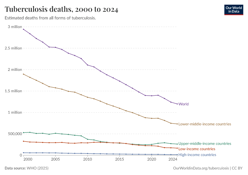 WHO (2025) – with minor processing by Our World in Data. “Tuberculosis deaths” [dataset]. WHO, “Global Tuberculosis Report - Burden Estimates” [original data]. Retrieved February 25, 2026 from https://style-housekeeper-simplifyre.owid.pages.dev:8789/20260205-170810/grapher/tuberculosis-deaths-who.html (archived on February 5, 2026).