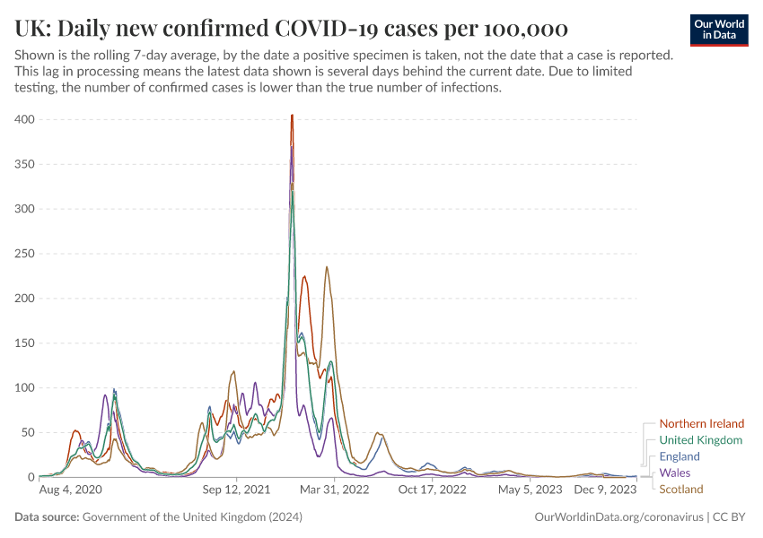 Government of the United Kingdom (2024) – with minor processing by Our World in Data. “UK: Daily new confirmed COVID-19 cases per 100,000” [dataset]. Government of the United Kingdom, “UKHSA data dashboard” [original data]. Retrieved February 25, 2026 from https://style-housekeeper-simplifyre.owid.pages.dev:8789/20250909-093708/grapher/uk-daily-covid-cases-7day-average.html (archived on September 9, 2025).